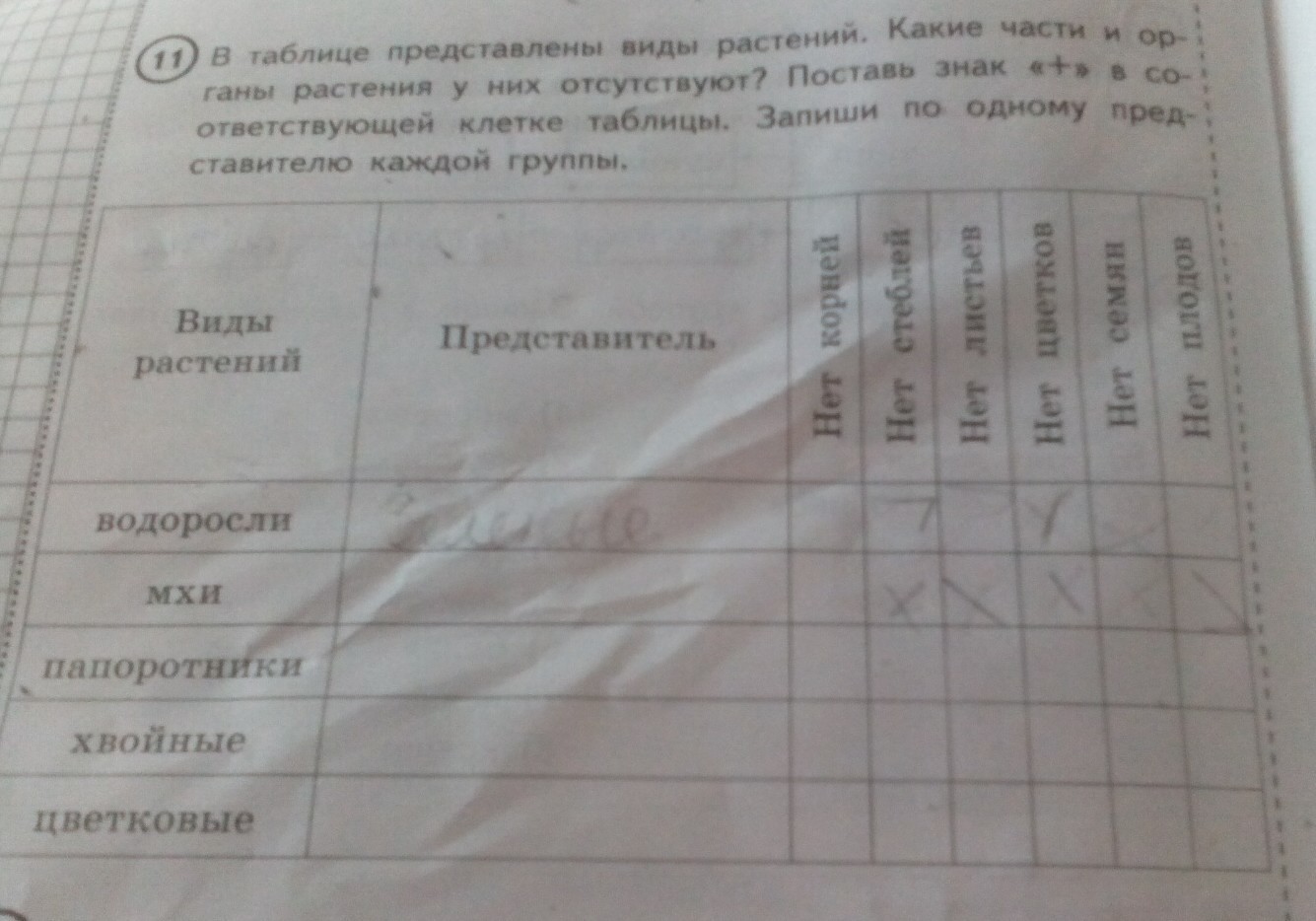 В таблице представлены. виды растений.Какие части и органы отсутствуют.Запиши по одному представителю