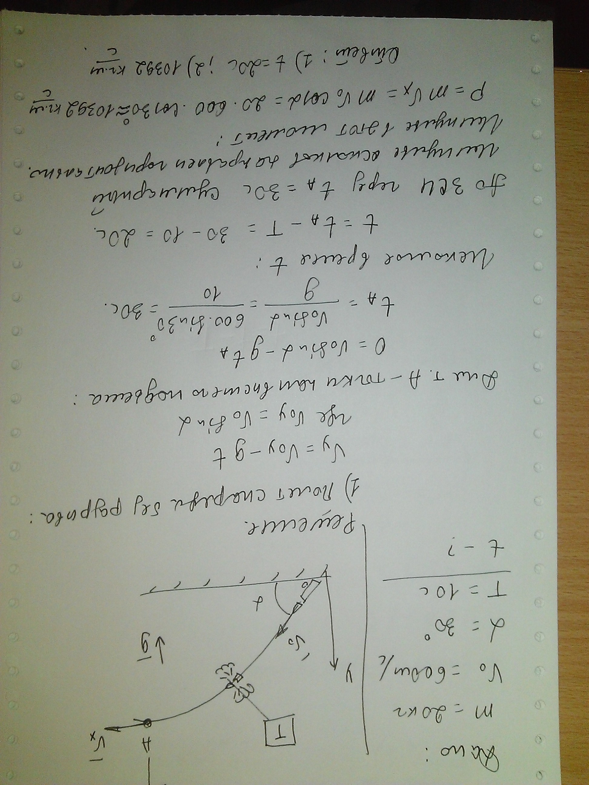 Снаряд массой m=20 кг, выпущенный со скоростью v0=600 м/с под углом альфа= 30 к горизонту, через T =10 с разрывается на осколки. Через какое время t после разрыва снаряда суммарный импульс P осколков будет направлен горизонтально, если известно, что все осколки ещё находятся в полете? Найдите модуль P*(T +t) импульса в этот момент времени. Силы сопротивления воздуха, действующие на снаряд и осколки, не учитывайте.