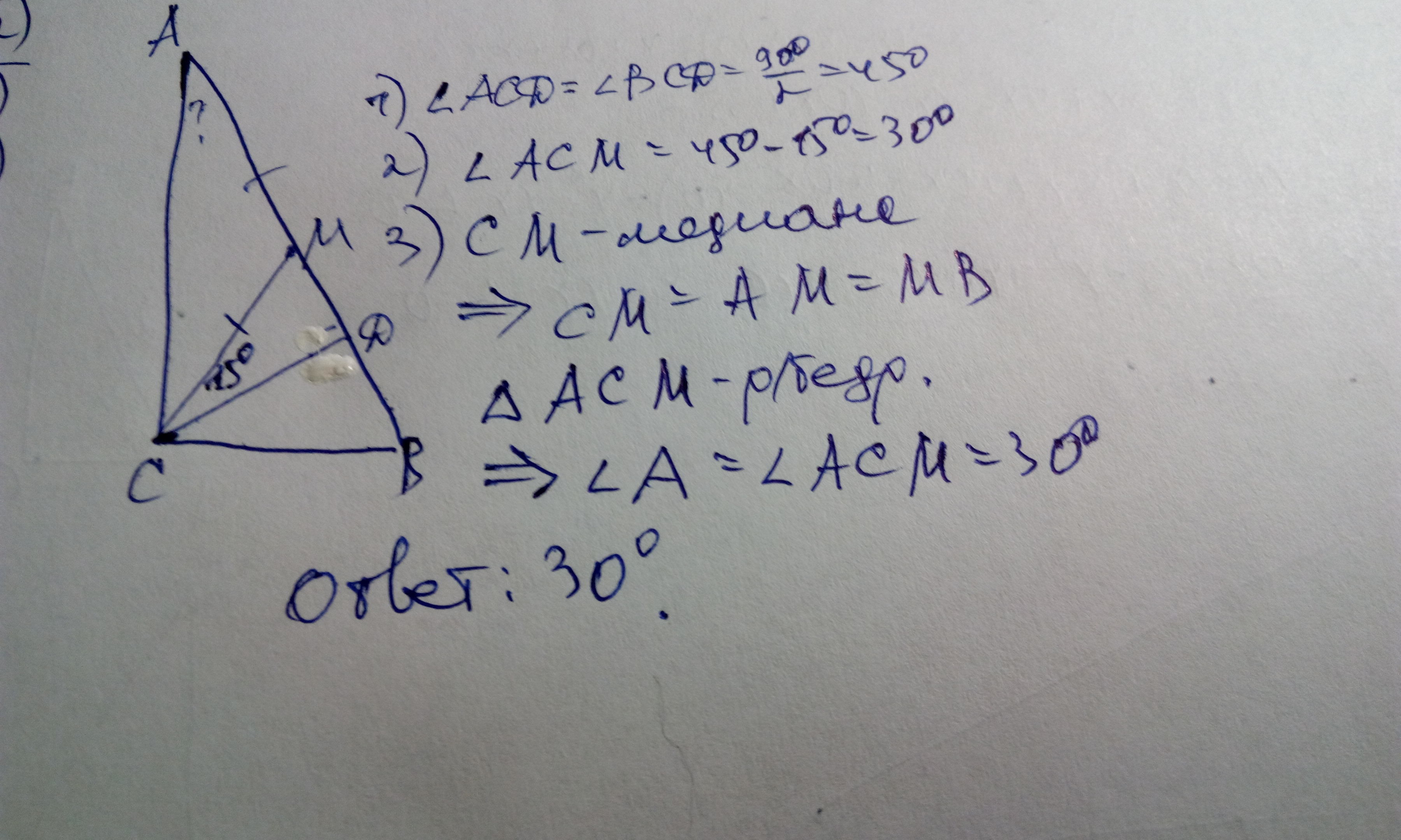 В некотором прямоугольном треугольника из вершины прямого угла провели биссектрису и медиану. Оказалось, что угол между ними равен 15∘. Найдите градусную меру меньшего угла треугольника.