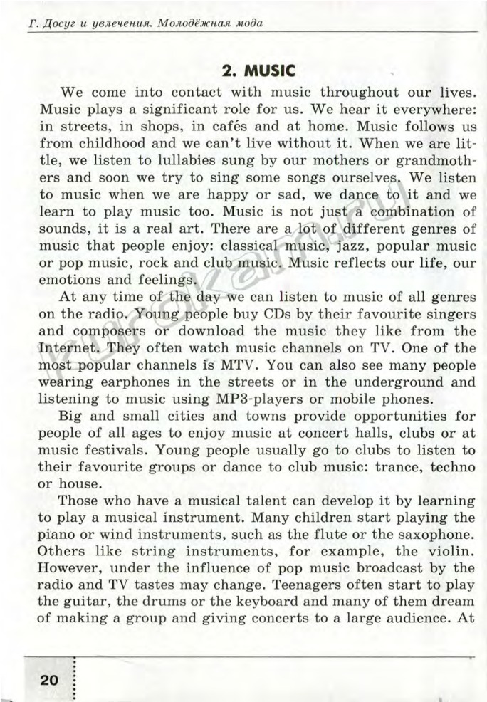 Мы вступаем в контакт с музыкой на протяжении всей нашей жизни. Музыка играет значительную роль для нас. Мы слышим это повсюду: на улицах, в магазинах, в кафе и дома. Музыка следует нам с детства, и мы не можем жить без нее. Когда мы зажигаемся, мы слушаем колыбельные, исполненные нашими матерями или бабушками, и вскоре мы пытаемся спеть некоторые песни сами. Мы слушаем музыку, когда мы счастливы или грусти, мы танцуем с ней, и мы также учимся играть на музыке. Музыка - это не просто сочетание звуков, это настоящее искусство. Есть много разных жанров музыки, которыми пользуются люди: классическая музыка, джаз, популярная музыка или поп-музыка, рок и клубная музыка. Музыка отражает нашу жизнь, наши эмоции и чувства. В любое время дня мы можем слушать музыку всех жанров по радио. Молодые люди покупают компакт-диски своими любимыми певцами и композиторами или скачивают музыку из Интернета. Они часто смотрят музыкальные каналы по телевизору. Одним из самых популярных каналов является MTV. Вы также можете видеть, как многие люди носят наушники на улицах или в метро и слушают музыку с помощью MP3-плееров или мобильных телефонов. Большие и малые города и поселки предоставляют возможность людям всех возрастов наслаждаться музыкой в концертных залах, эльбах или музыкальных фестивалях. Молодые люди обычно ходят в клубы, чтобы слушать любимые группы или танцевать в клубной музыке: транс, техно или дом. Те, у кого есть музыкальный талант, могут развить его, научившись играть на музыкальном инструменте. Многие дети начинают играть на фортепиано или духовые инструменты, такие как флейта или саксофон. Другие, например, струнные инструменты, например, скрипка. Однако под влиянием поп-музыки, транслируемой по радио и телевизионным вкусам, может измениться. Подростки часто начинают играть на гитаре, барабанах или клавиатуре, и многие из них мечтают создать группу и дать концерты большой аудиторииЭто текст с первой картинки