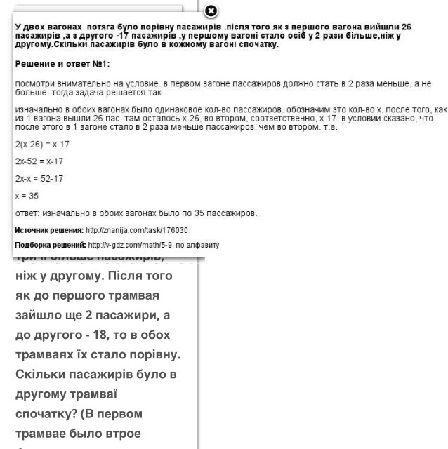 поможіть плис У двох вагонах поїзда їхало поривну пасажирів. Після того, як з першого вагона вийшло 26 пасажирів, а з другого 17 пасажирів, у першому вагоні стало пасажирів у 2 рази менше, ріж у другому.Скільки пасажирів було в кожному вагони спочятку