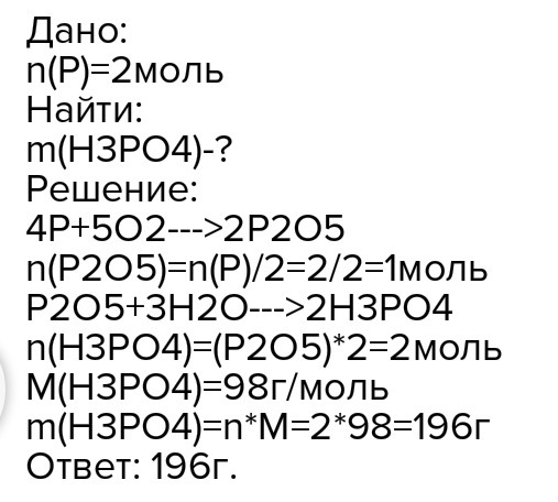 Сожгли 2 моль фосфора. Полученный оксид растворили в воде. Рассчитайте сколько граммов ортофосфорной кислоты при этом получено.(Напишите пожалуйста ДАНО)