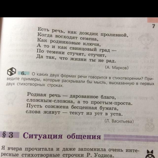 Ребятушки помогите!!!!!!!номер 6 ответ на вопрос о каких двух формах речи говориться в стихотворении?