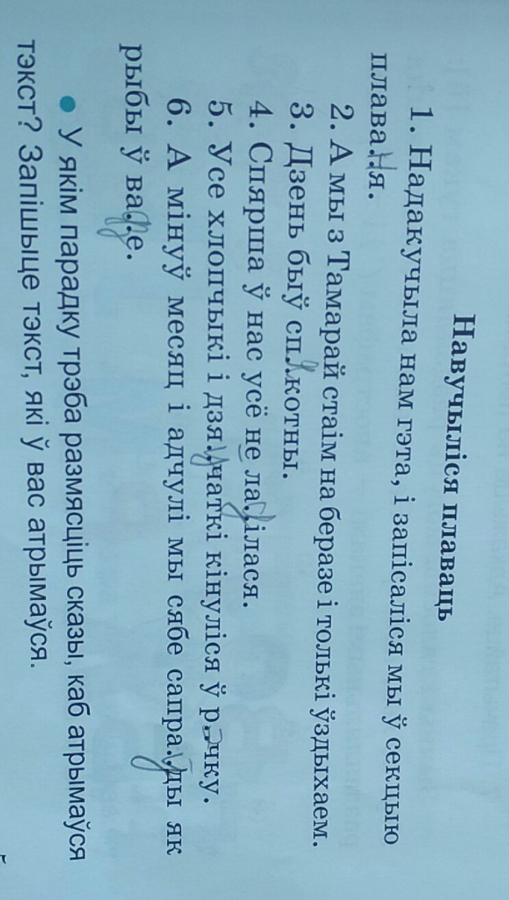 надаело нам это, и записались мы в секцыю по плаванию. А мы с тамарой стаим на берегу и только вздыхаем. день был жаркий. сначала у нас всё не получалось. все мальчики и девочки кинулись в речку. а прошёл месяц и почувстволи мы себя правда как рыбы в воде.