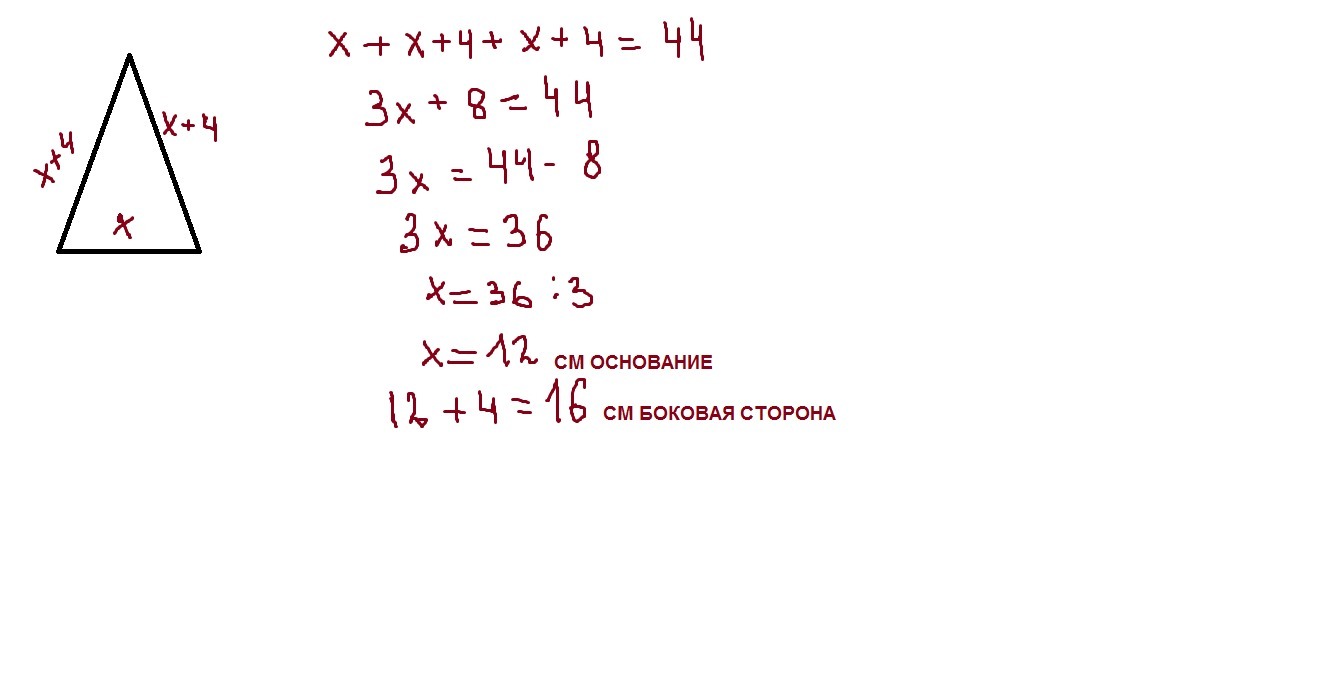 боковая сторона равнобедренного треугольника на 4см длинее основания,а периметр треугольника равен 44см.Найди основание и боковую сторону(решение.