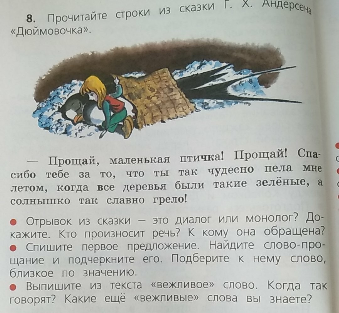 это монолог Дюймовочки, она обращается к ласточке. Это монолог потому что здесь речь одного лица - Дюймовочки.