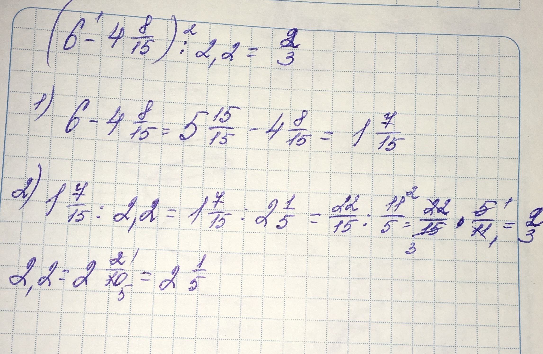 (6-4целых8/15):2,2 решите пожалуйста 6 класс