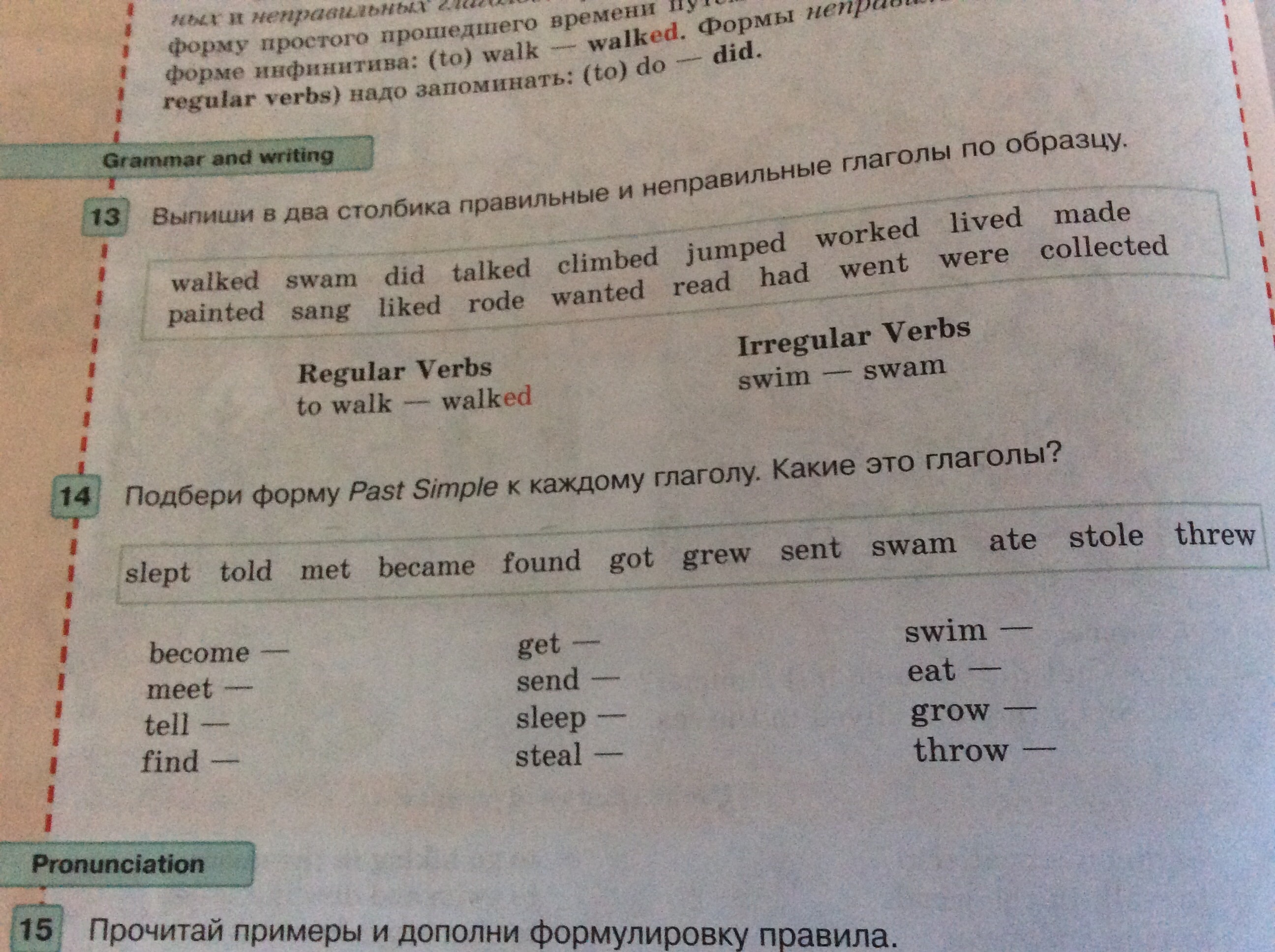 Become- became , meet- met, tell- told, find- found, get got, send sent, sleep slept, swim swam, eat ate, grow grew