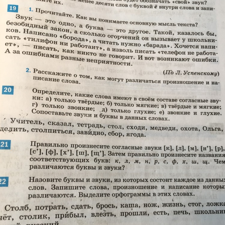е) словах (славах), сходи (схад'и), сказал (сказал), стол (стол), делить (д'эл'ит'), учитель (уч'ит'эл').