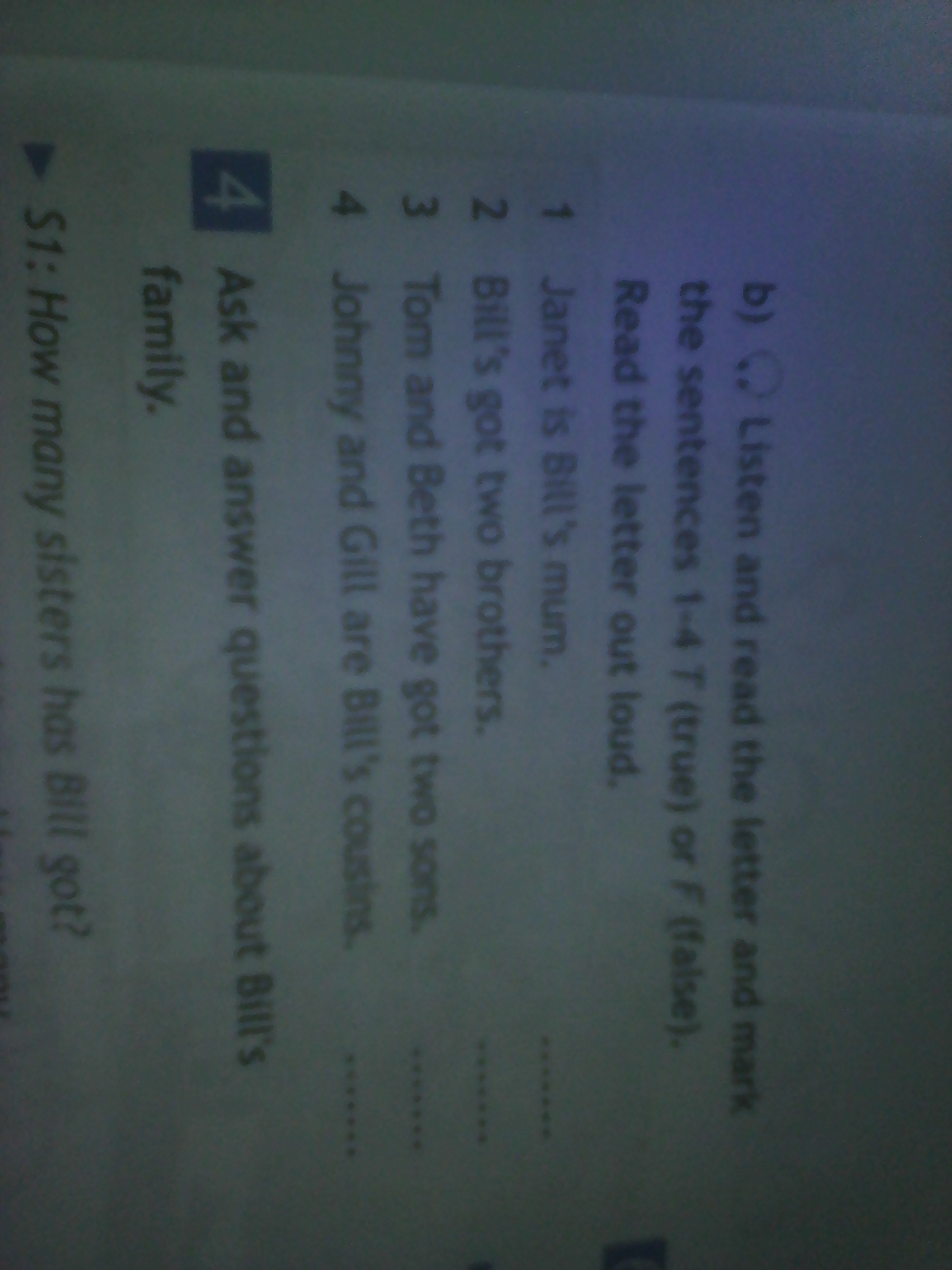 1 False: Sue is Bill’s mum 2 False: Bill’s got two sisters 3 True: Tom and Beth have at least two sons – Mike, who is Bill’s uncle, and Sam, who is Bill’s father 4 True: Johnny and Gill are Mike’s children, which means that they are Bill’s cousins