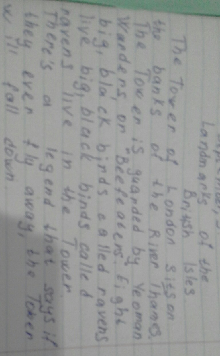 The Tower of london sitson the banks of the River Thames. Warders, or Beefe at ers. Fight big, black birds called ravens live in the Tower. There's a legend that says if they ever fly away , the Tower will fall cown.