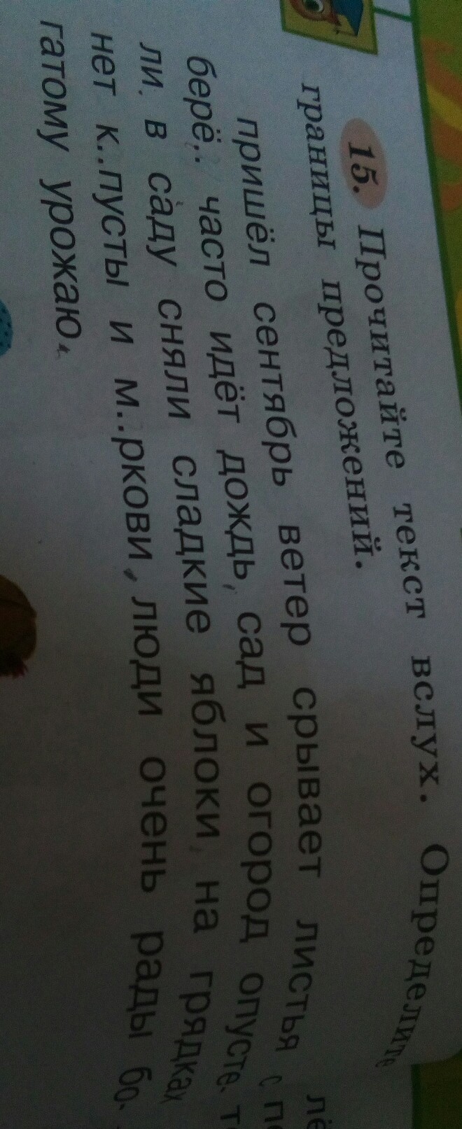 Пришёл сентябрь. Ветер срывает листья с берёз, часто идёт дождь, сад и огород опустели. В саду сняли сладкие яблоки, на грядках нет капусты и моркови, люди очень рады богатому урожаю.