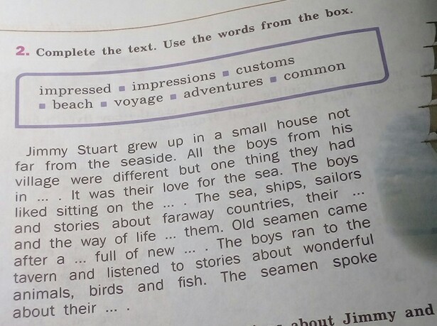 Джимми Стюарт вырос в маленьком домике недалеко от морского побережья. Все мальчики из его деревни были разными, но была одна вещь, в которой они были схожи. Это (была) их любовь к морю. Ребята любили сидеть на пляже. Море, корабли, моряки, и истории о дальних странах, их форма, и образ жизни впечатлял их.