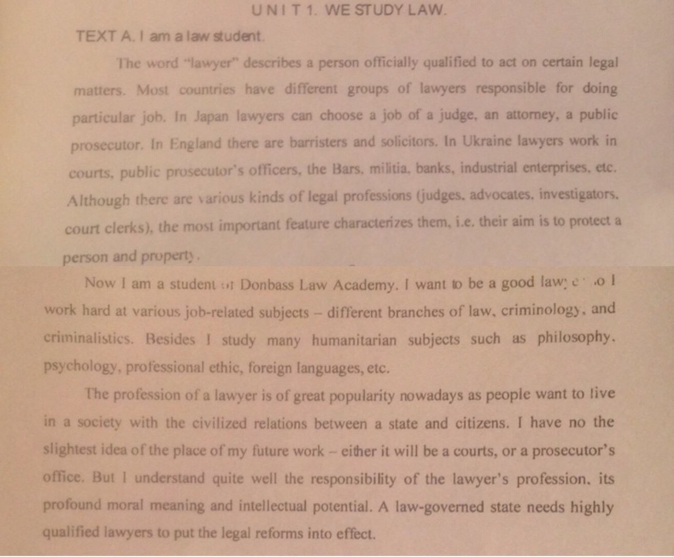 Я студент-юрист. Слово «юрист» описывает лицо, имеющее официальную квалификацию, так действующее по определенным юридическим вопросам. В большинстве стран существуют разные группы юристов, ответственных за выполнение конкретной работы. В Японии юристы могут выбрать работу судья, аттомея, прокурор, в Англии есть адвокаты и адвокаты. В Украине юристы работают в судах, общественных плутонах, барах, наемницах, промышленных предприятиях, ctc. Хотя существуют различные виды адвокатских профессий. исследователи. Канцелярии, самая важная особенность их характеризует, т. е. их цель - защитить человека и преданность. Теперь я студент Донбассского юридического факультета, я хочу быть хорошим законом: работайте над различными предметами, связанными с работой, в разных областях криминалистика и криминалистика Кроме того, изучаются многие гуманитарные предметы, такие как философия психологии, профессиональная этика, иностранные языки, эль. Профилактика адвоката пользуется большой популярностью нет в то время как люди хотят жить в обществе с цивилизованными отношениями между государством и гражданами. 1 не имеют ни малейшего представления о месте моей будущей работы, будь то суды или прокуратура. Но я хорошо понимаю ответственность адвоката. его глубокий моральный смысл и интеллектуальный потенциал. Государственному государству нужны высококвалифицированные юристы для реализации правовых реформ. 3AKPblTb