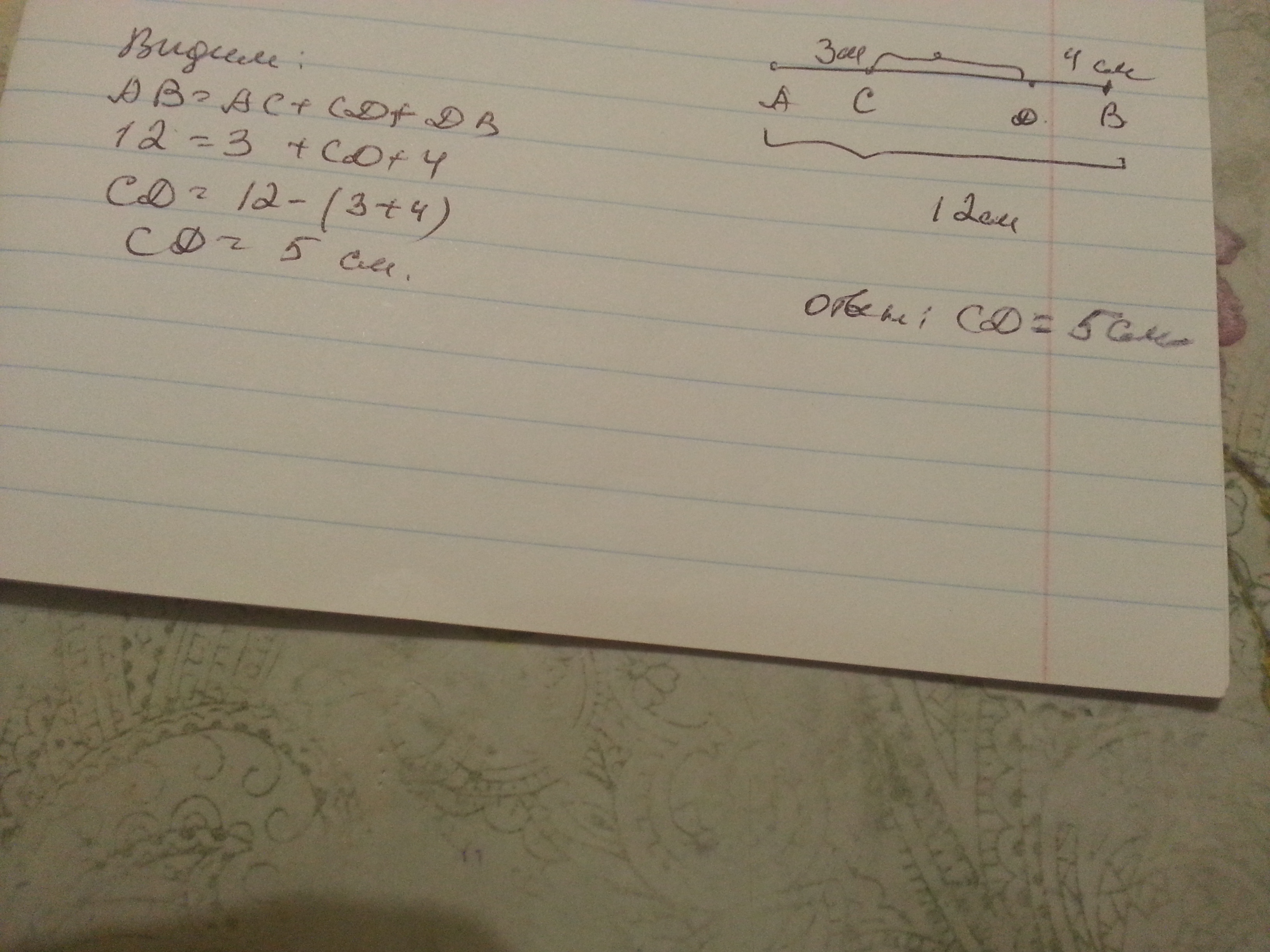 На отрезке АВ взяты точки С и D. Найдите длину отрезка CD, если АВ=12см, АС=3см, BD=4см