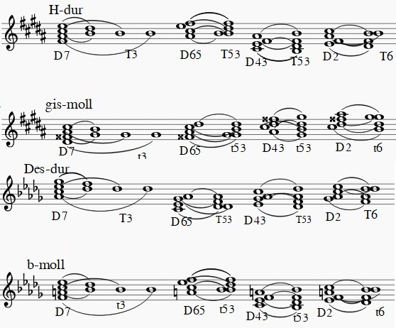 Постройте доминантовый септаккорд с обращениями в мажоре и гармоническом миноре которые имеют пять знаков альтерации при ключе с разрешениями и подпишите их.