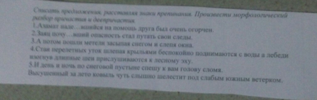 Стая перелётных уток, | шлёпая (дееприч.) крыльями | ( - . - . - . - ), беспокойно поднимаются с воды, а лебеди, | изогнув (дееприч.) длинные шеи | ( - . - . - . - ), прислушиваются к лесному эху.
