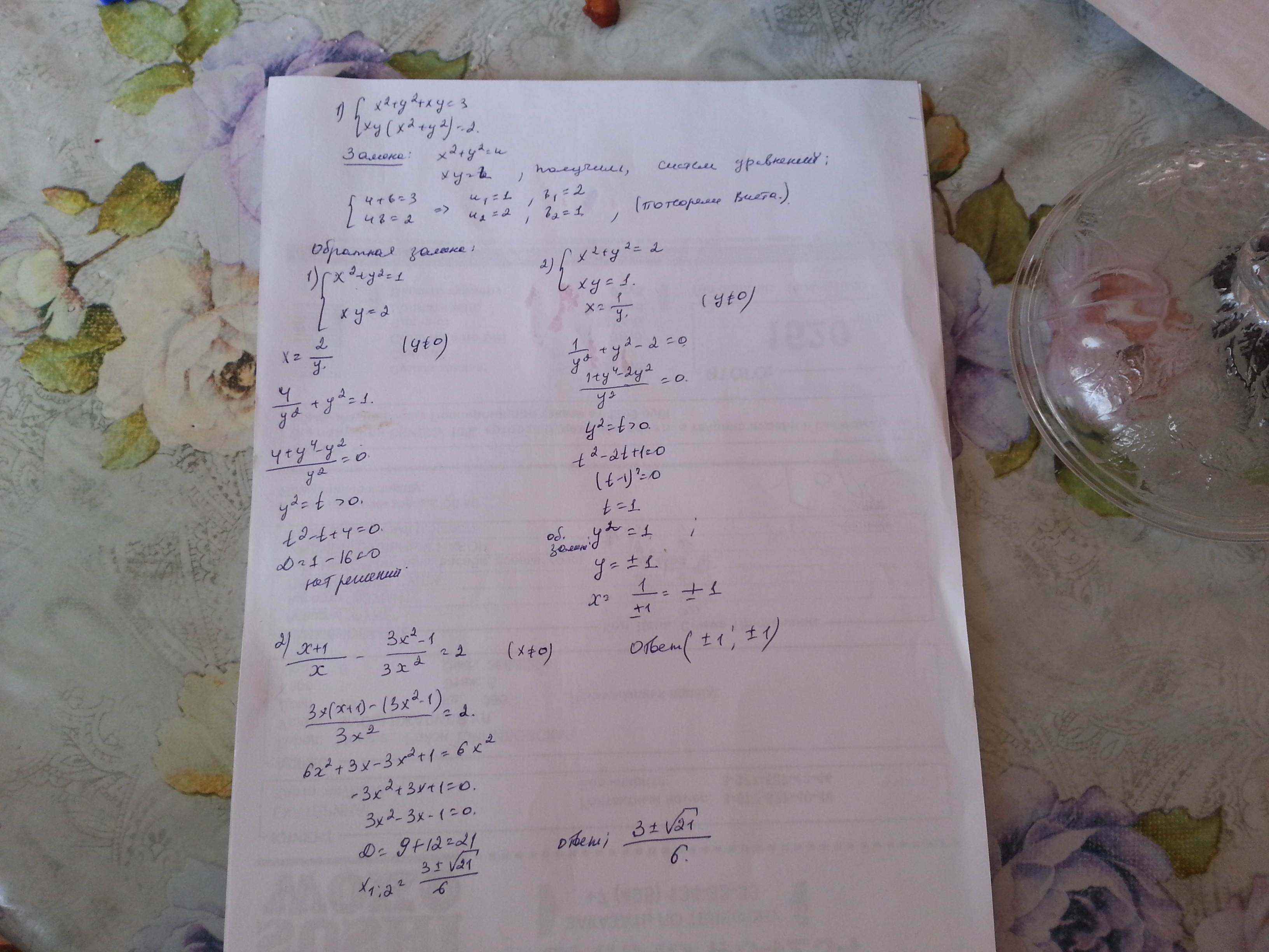 1)x^2 + y^2 + xy = 3 и 2)xy(x^2 + y^2) = 2