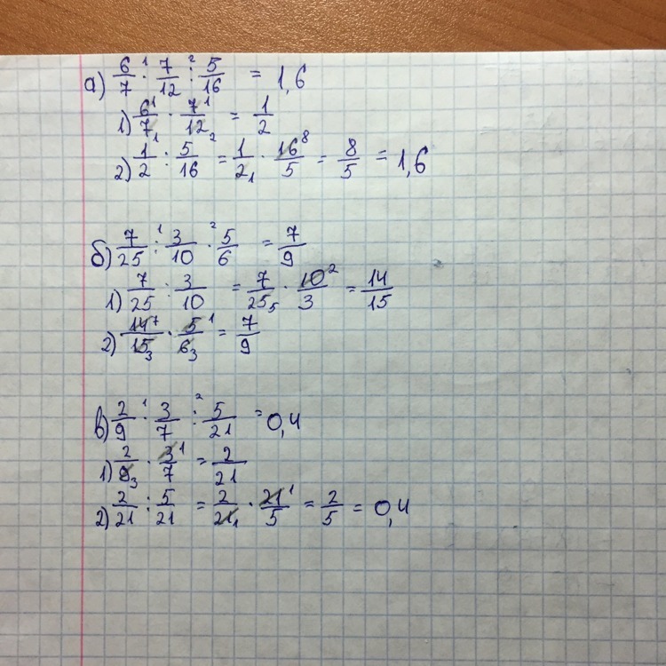 б)7/25:3/10*5/6=7/25*3/10*5/6=7/25*1/4=7/100