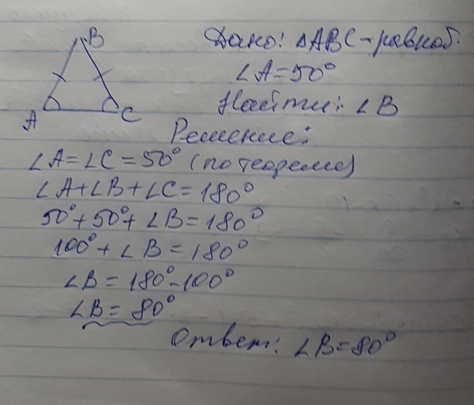 При основании равнобедренного треугольника равна 50 .Знайдить угол при вершине этого треугольника