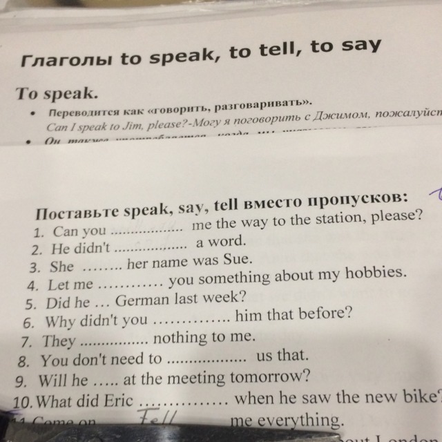 Помогите вставить speak say tell в нужном времени