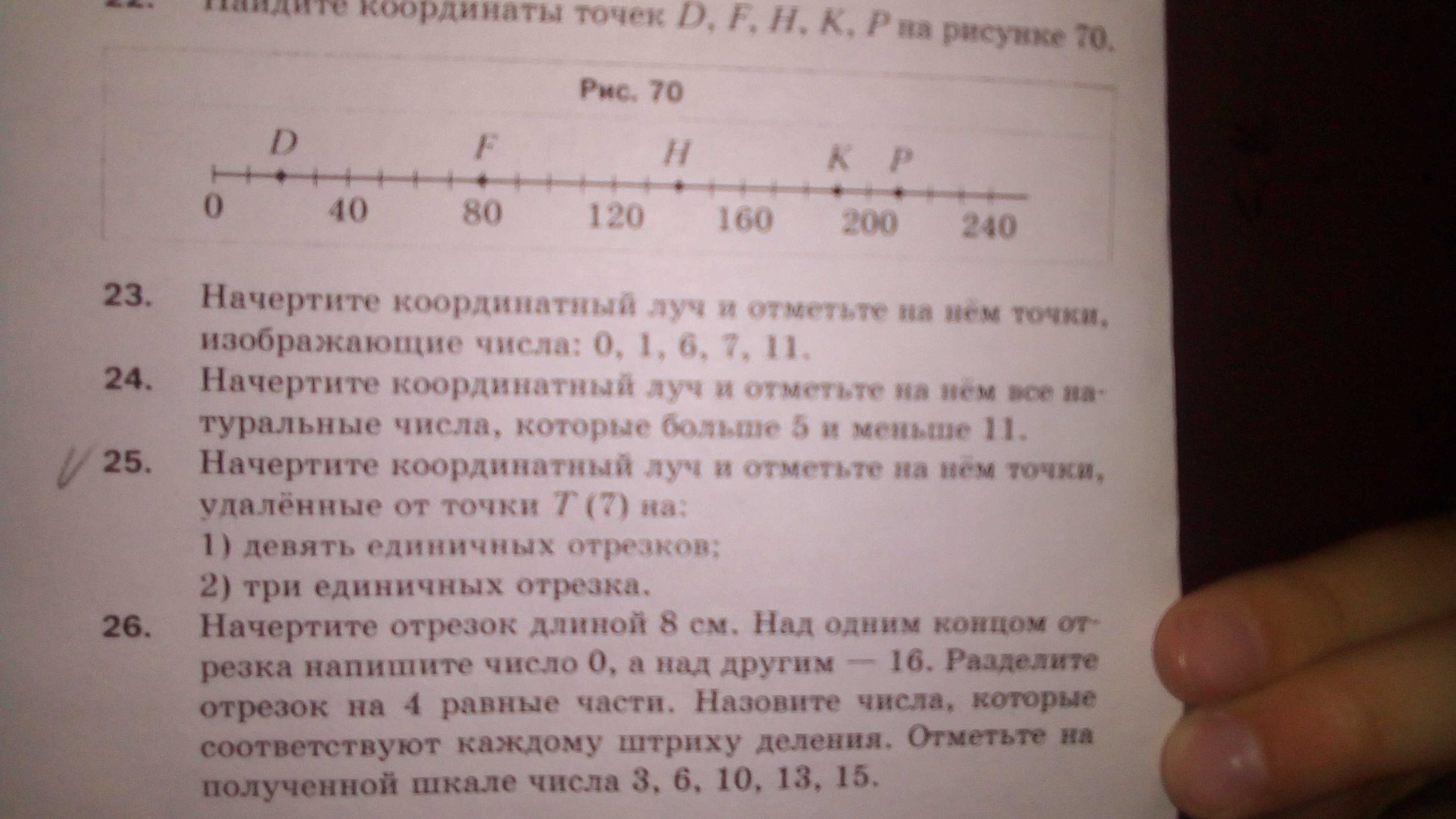 Чертите координатный луч (17 клеток). На 7-ой клетке ставить точку и сверху подписываете "Т". На 16-ой ставите точку и на 4-ой