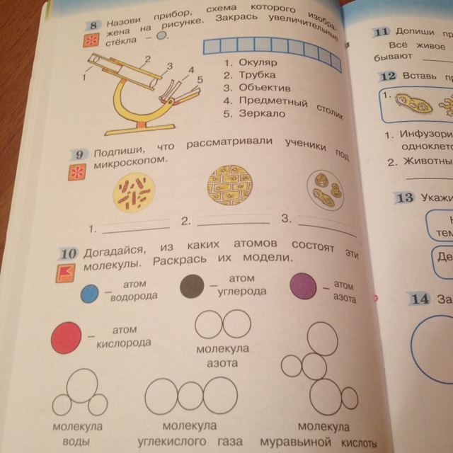 9 Подпиши, что рассматривали ученики под микроскопом.