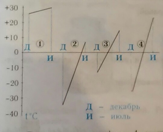 на графиках 1-3 показаны средние температуры декабря и июля в трёх разных местностях.определите и заришите,какой климат в каждой из этих местностей?