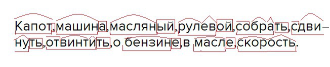 Разобрать слова по составу. Слова: Капот,машина,масляный,рулевой,собрать,сдвинуть,отвинтить,о бензине,в масле,скорость.