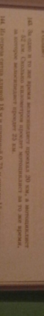 за одно и то же врем велосипедист проехал 20км а мотоциклист 52км сколько километров проедет мотоциклист за то же время за которое велосипедист проедит 25 км