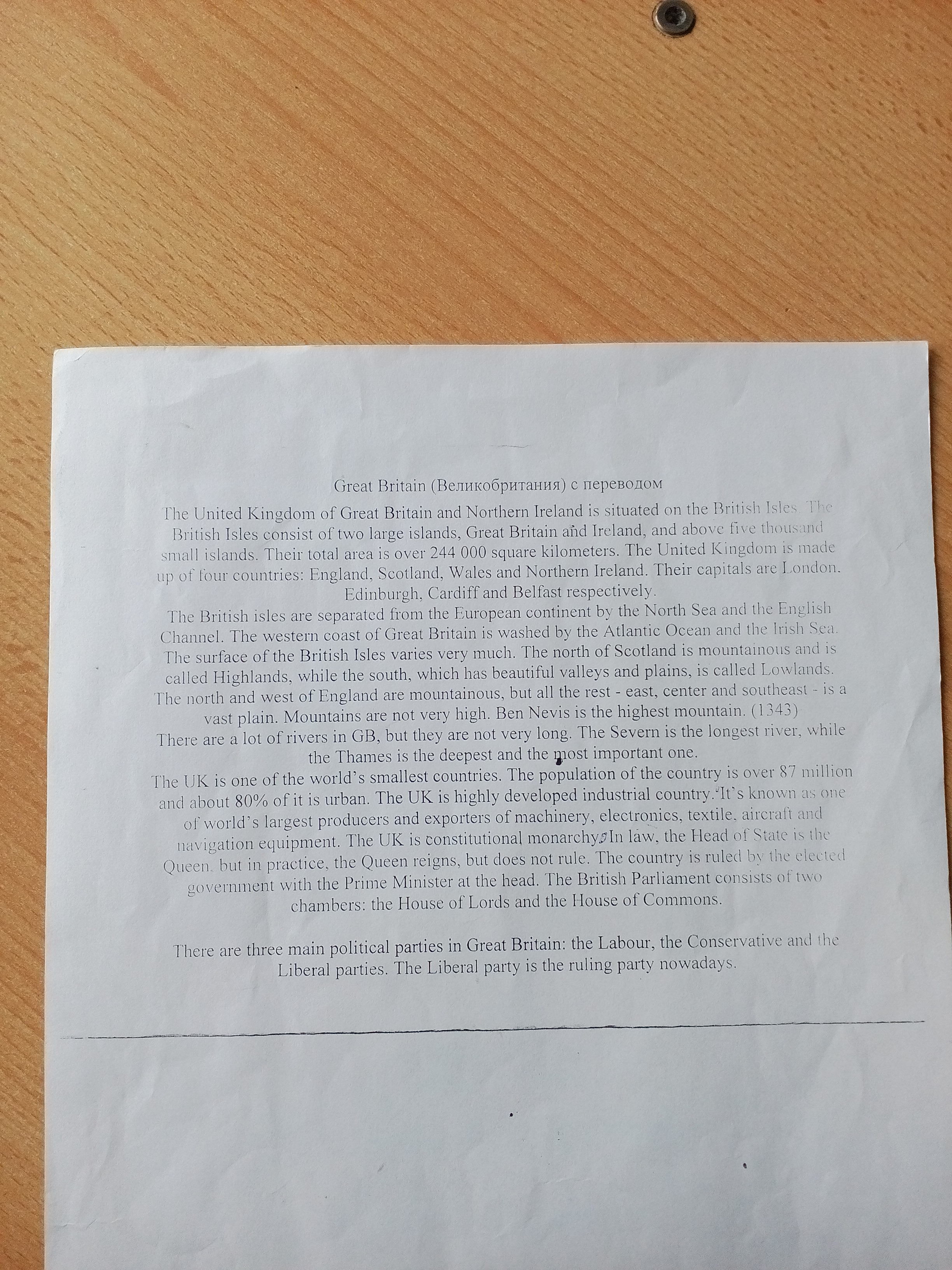 Соединенное Королевство (сокращенное название Соединенного Королевства Великобритании и Северной Ирландии) расположено на двух больших островах, которые называются Британскими островами. Больший из этих островов называется Великобританией и состоит из трех частей: Англии, Шотландии и Уэльса. Меньший остров - Ирландия. Южная Ирландия называется Ир или Республикой Ирландия и является страной, не зависящей от Великобритании.
