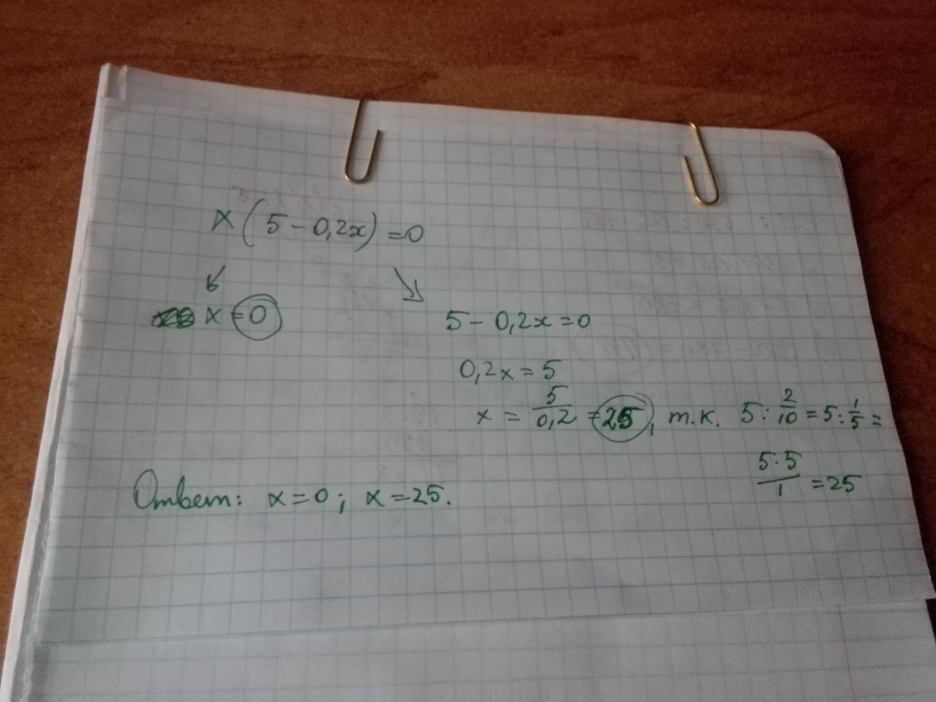 Решите уравнение: x(5-0,2x)=0