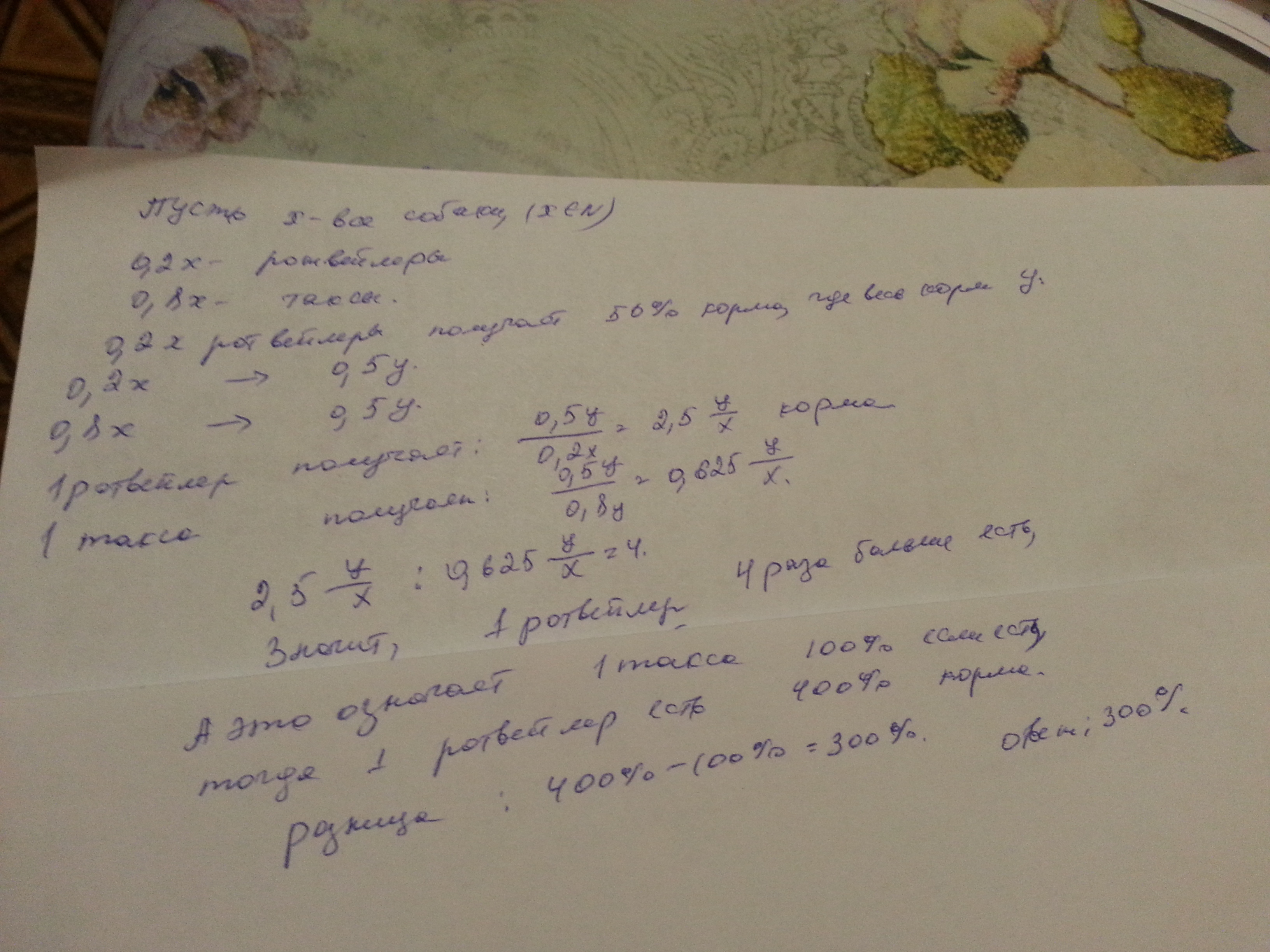 В вольере содержатся ротвейлеры и таксы. Ротвейлеры, составляющие 20 % числа всех собак в вольере, получают 50 % всего корма. На сколько процентов одна такса получает меньше корма, чем один ротвейлер?