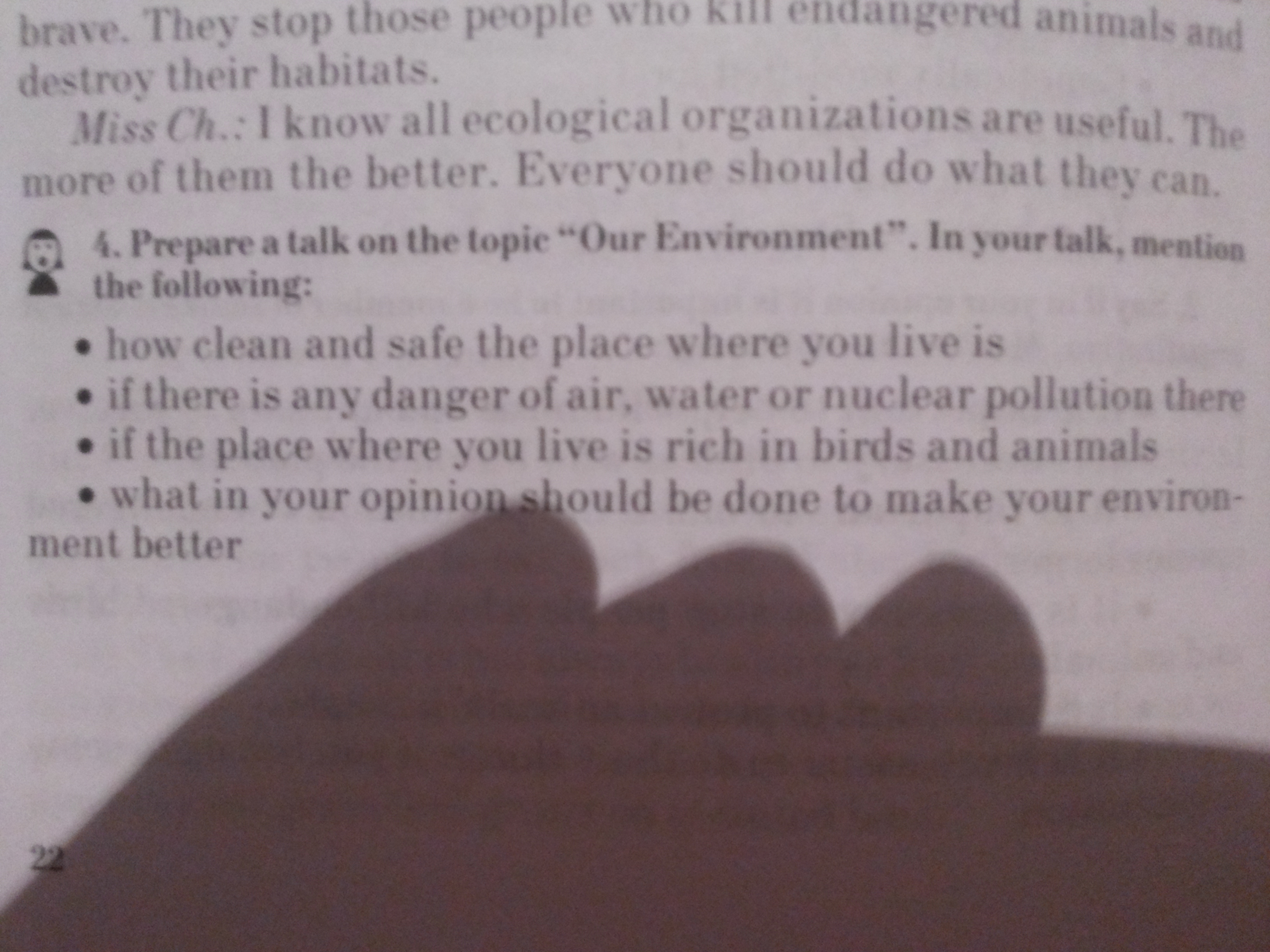 There are a lot of factories which throw waste and pollute rivers and seas.Существует много заводов, которые выбрасывают отходы и загрязняют реки и моря.The most dangerous and unpleasant of them is the destruction of wildlife.Самая опасная и неприятная из них – это уничтожение диких животных.