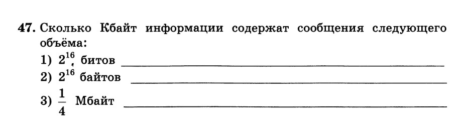 1) 2^16 бит = 2^16/2^13 Кбайт = 2^3 Кбайт = 8