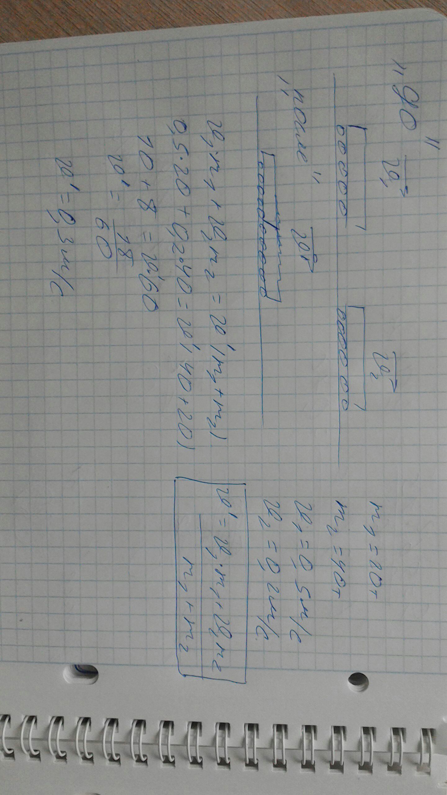 Вагон массой 20 т,движущийся со скоростью 0.5 м/с , нагоняет вагон массой 40 т движущийся со скоростью 0.2 м/с .какова скорость вагонов после взаимодействия, если удар неупругий ?