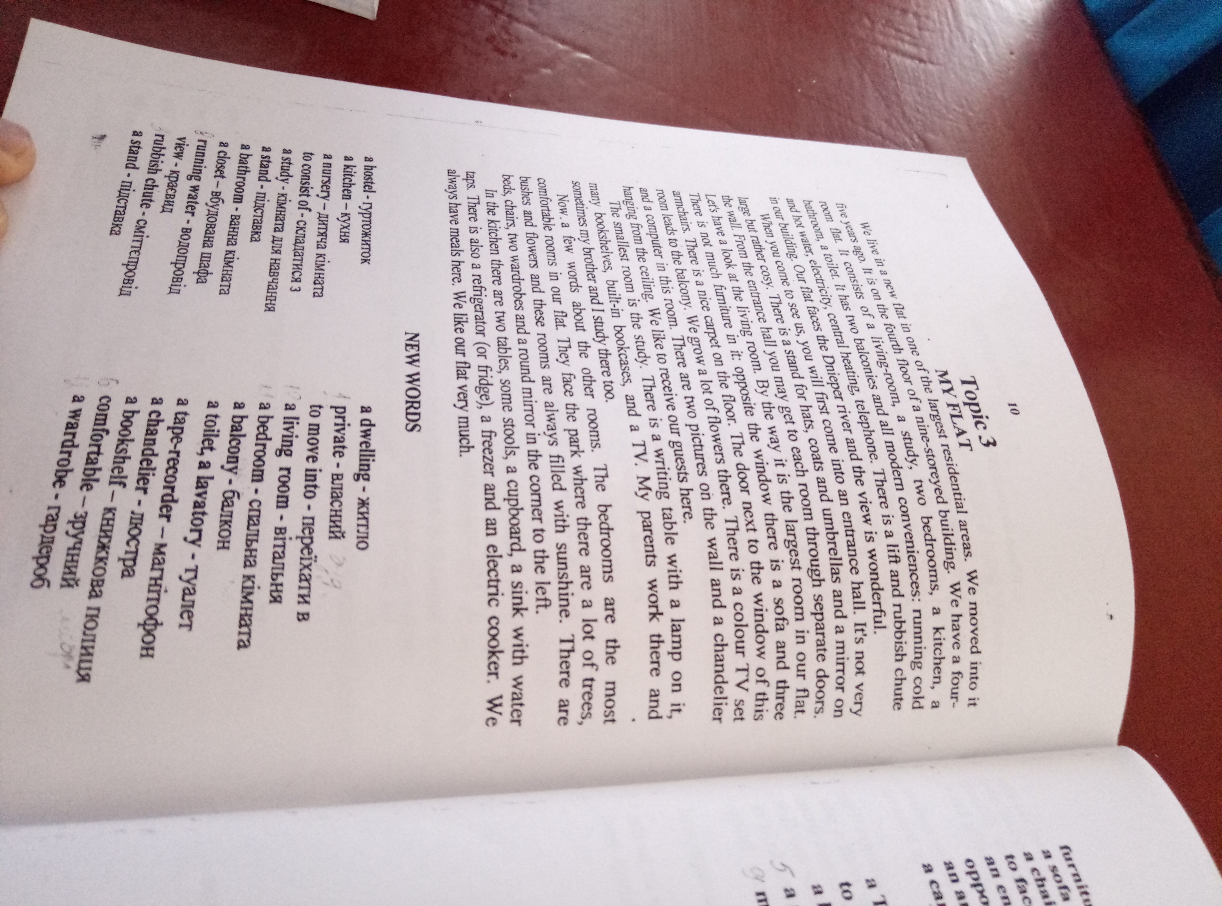 Мы живем в новой квартире в одном из огромнейших жилых районов . Мы переехали сюда пять лет назад . Наша квартира на 4 этаже 9-ти этажного здания . У нас 4-ех комнатная квартира . Она включает в себя комнату для проживания , учебную комнату , две спальни , кухню , ванную и туалет . Также тут два балкона и новейшие удобства : холодная и горячая вода , электричество , отопление , телефон . В нашем здании есть лифт и мусоропровод . Наша квартира имеет вид на реку Днепр и этот вид прекрасен .