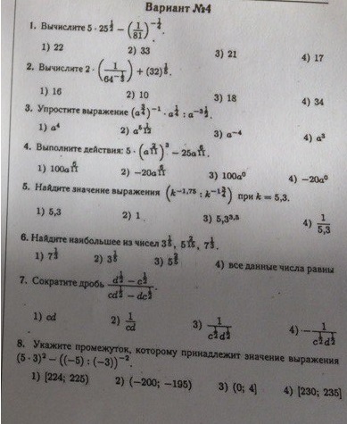 1) 5·25^1/2 - 1/81^-1/4 = 5 ·√25 - ⁴√81 = 25 - 3 = 22 Ответ 1)