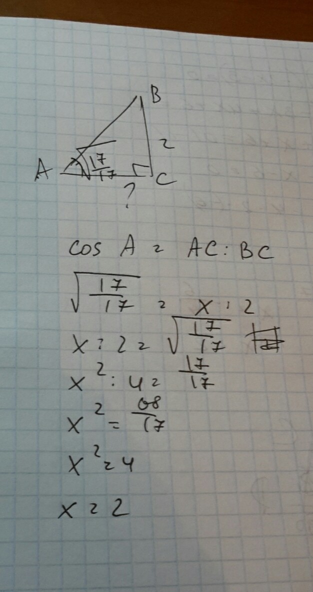 В треугольнике ABC равен 90 градусов, BC=2,cosA=корень из 17/17, найдите AC