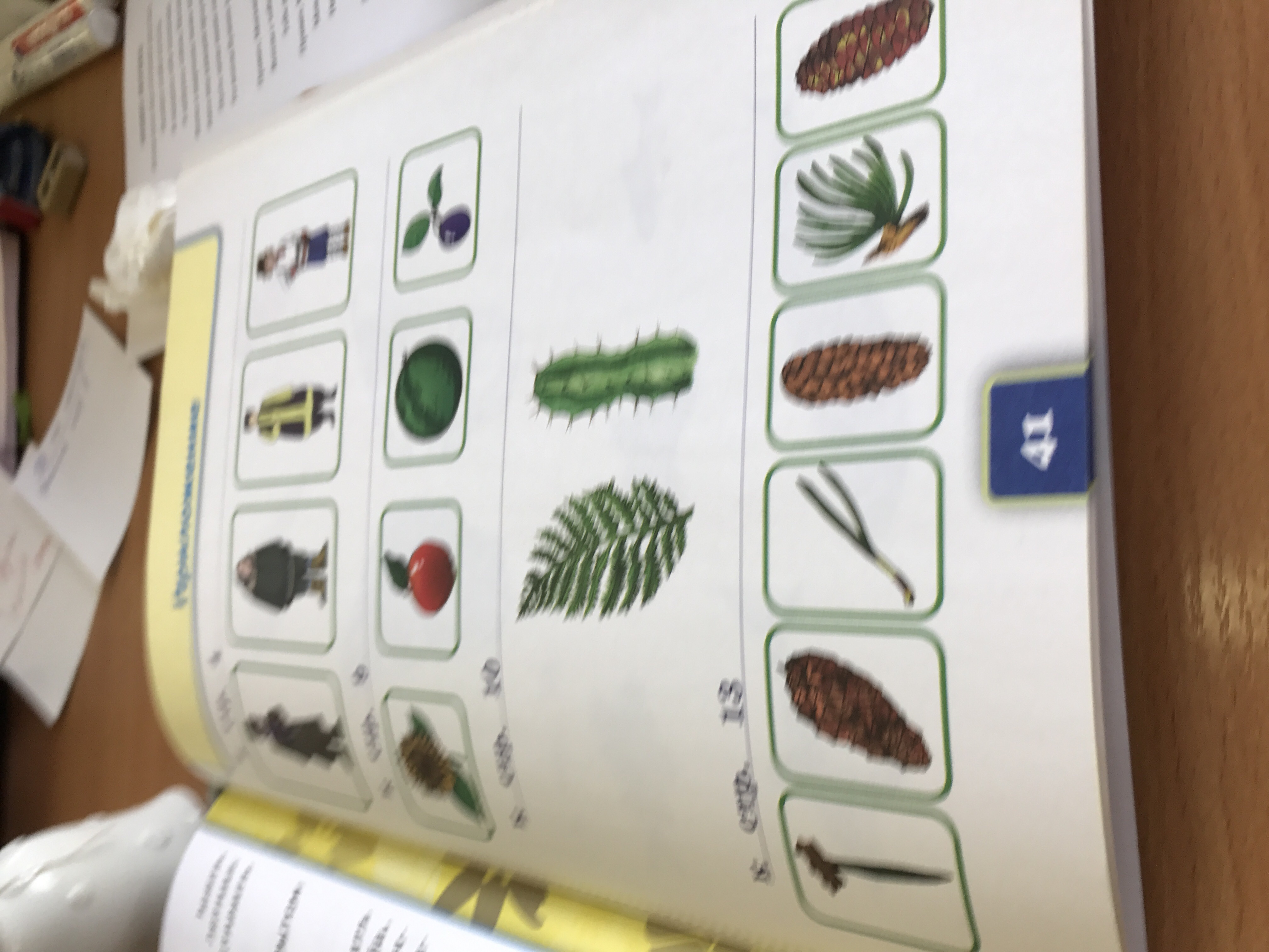 слева на право иголка ели,шишка сосны,иголка кедра,шишка кедра,иголка сосны,шишка ели