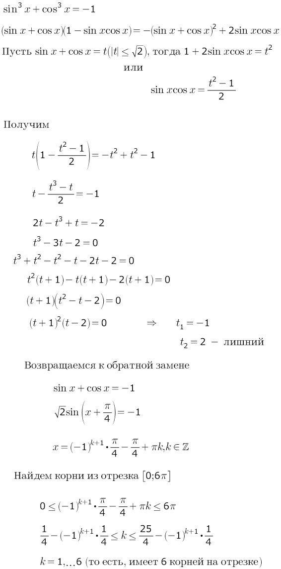 Рассмотрим уравнение sin в кубе+cos в кубе=-1. Сколько у него решений на промежутке [0.6П]?