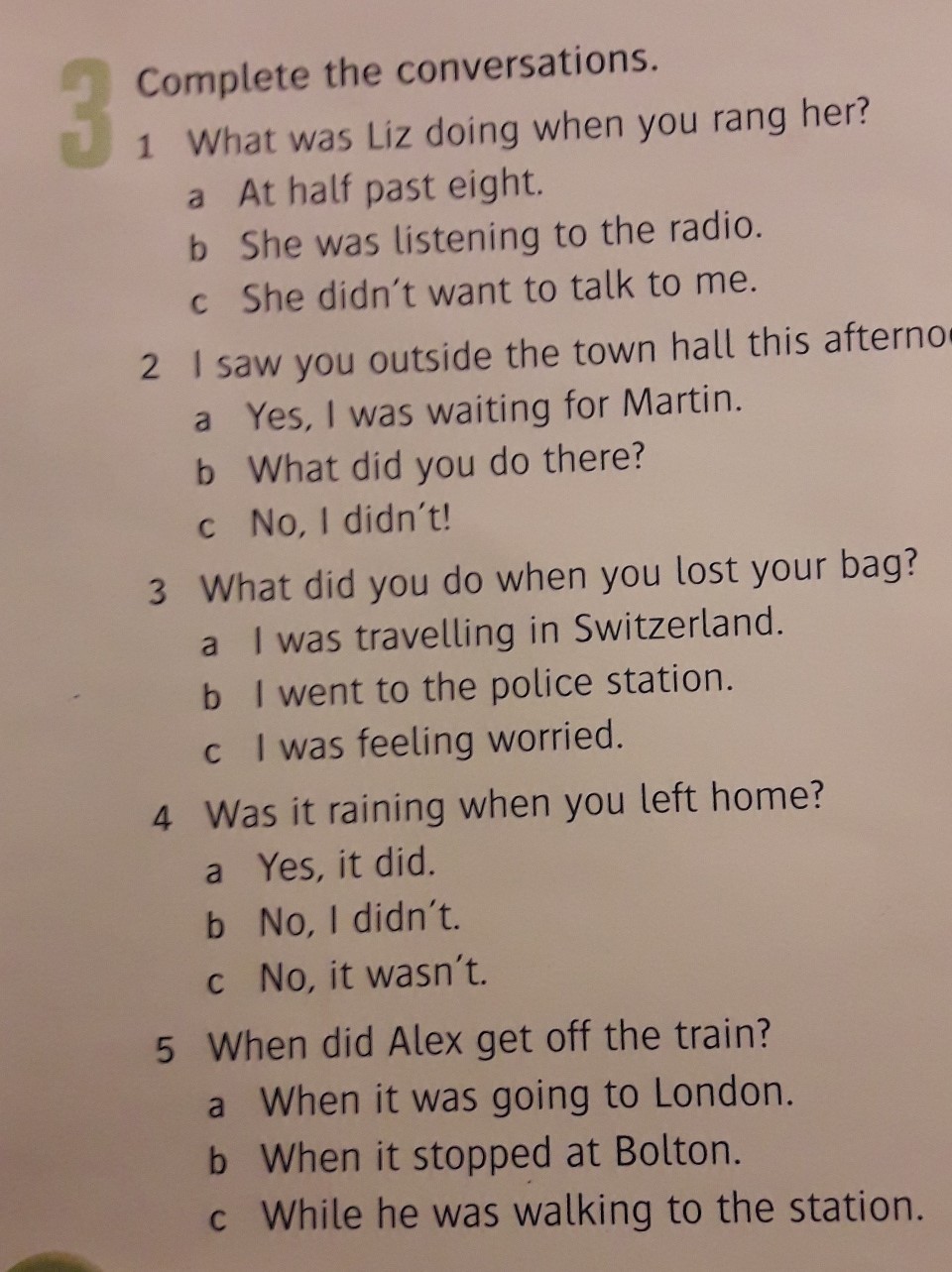 Завершить разговоры. Что делала Лиз, когда ты звонил ей? а в половине восьмого. b Она слушала радио. Ц она не хотела говорить со мной 2 я видел вас возле ратуши этот afternc да, ждал Мартин. Что ты там делал? Нет, нет! Что ты сделал, когда потерял сумку? a Я путешествовал в Швейцарии. пошел в полицейский участок. С я чувствовал себя беспокоюсь. Шел дождь, когда ты ушел из дома? Да, это так. b Нет, нет. C Нет, не было. Когда Алекс сошел с поезда? Когда она собиралась в Лондон. Когда он остановился в Болтоне. Пока он шел до вокзала.