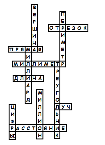 составить кроссворд со словами треугольник,миллиард миллиметр расстояние прямая цифра луч вершина длина периметр миллион отрезок ИЛИ напишите вопросы к каждому слову кроссворд сома составлю прошу очень надооо