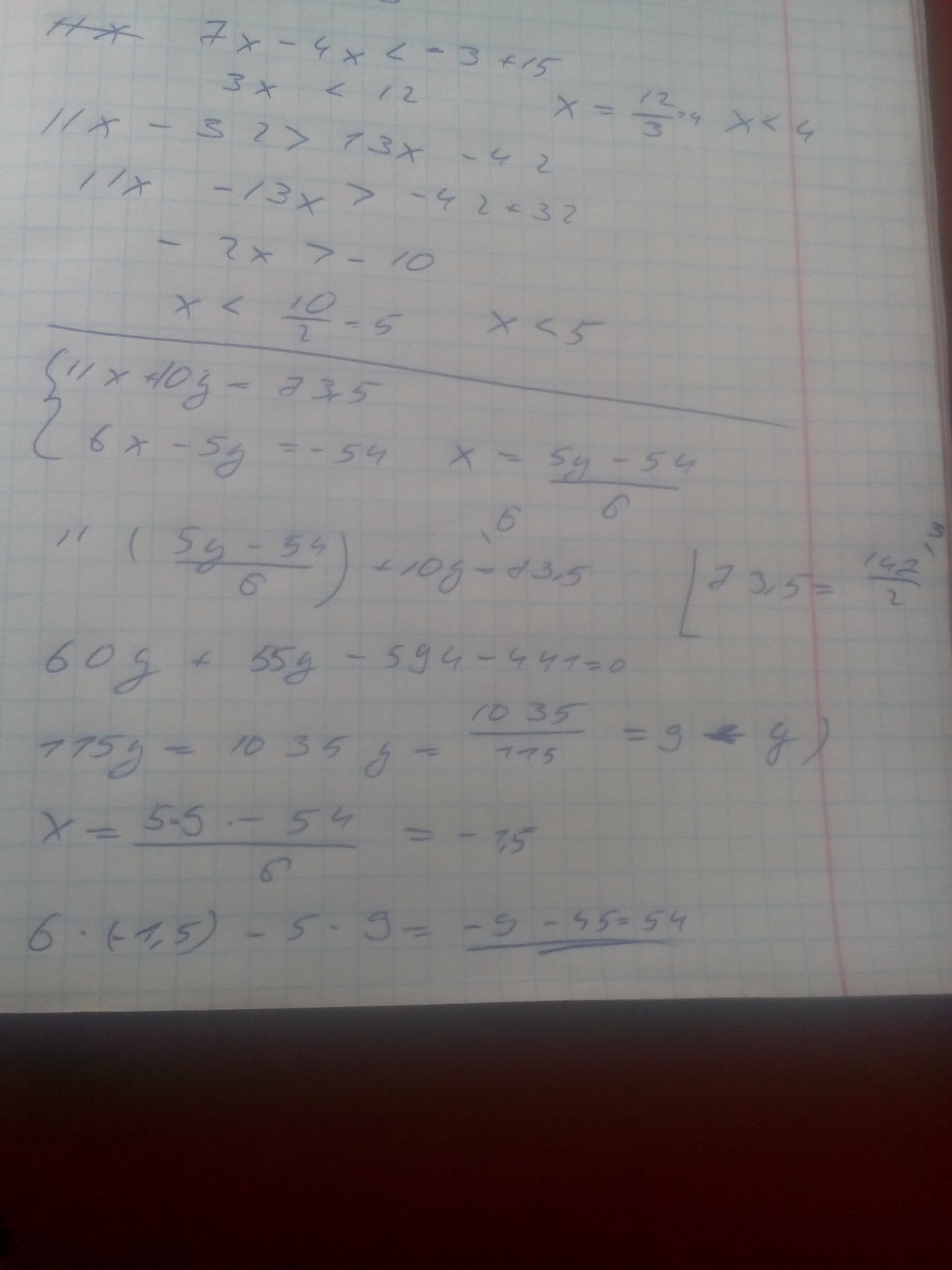 решите систему уравнении { 11х+10у=73,5 {6х-5у=-54