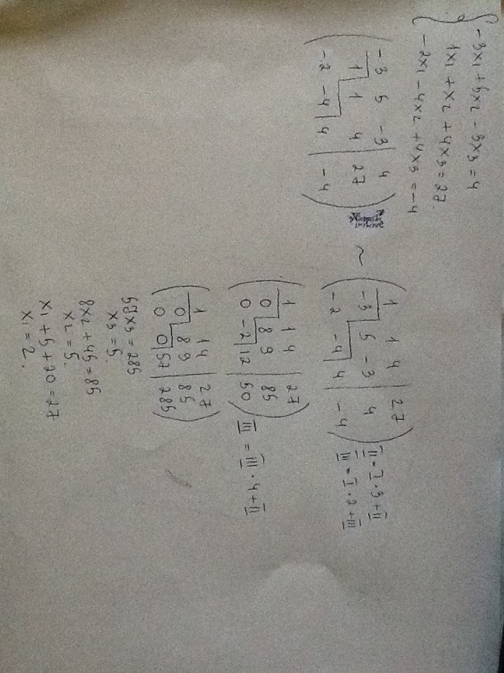 Из 3-ой строки выражаем x1: (27 - (5+4*5) = 2