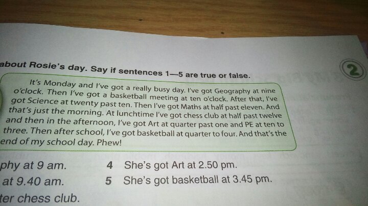 Понедельник и у меня очень занятый день. У меня география в 9 часов. Затем у меня баскетбольная игра\встреча в 10 часов. После у меня Естественные науки\наука в 20 минут 11. Затем у меня математика в 11:30. И это только утро. В обед у меня (занятие) в шахматном клубе в 12:30 и потом после полудня у меня рисование в четверть первого и физ-ра без десяти 3. После школы у меня баскетбол без 15 минут 4-ого. И это конец моего учебного дня. Фух!