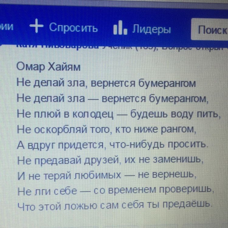 автор советует нам в жизни не тратить зря время на пустоту, пустые дела и хлопоты. Нужно беречь каждую минуту и проводить её в радости. Стараться в жизни видеть больше хорошего, путешествовать, познавать мир. Богатство, это не деньги, которые сегодня есть, а завтра нет, а это в хороших делах и поступках и помнить правило беранга, что все хорошее и плохое возвращается назад как бумеранг.Наверстать в старости не сумеешь. поэтому живи и наслаждайся сегодняшним днем, делай его для себя и окружающих счастливым!
