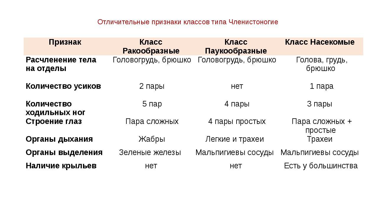 В основу деления типа членистоногие на классы положены следующие признаки:
