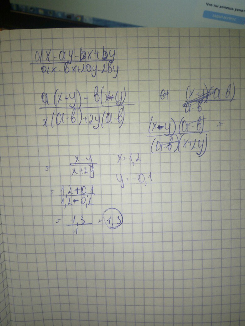 Сократительной дробь ax-ay-bx+by/ax-bx+2ay-2by подстпвьте значения x=1,2 y=-0,1
