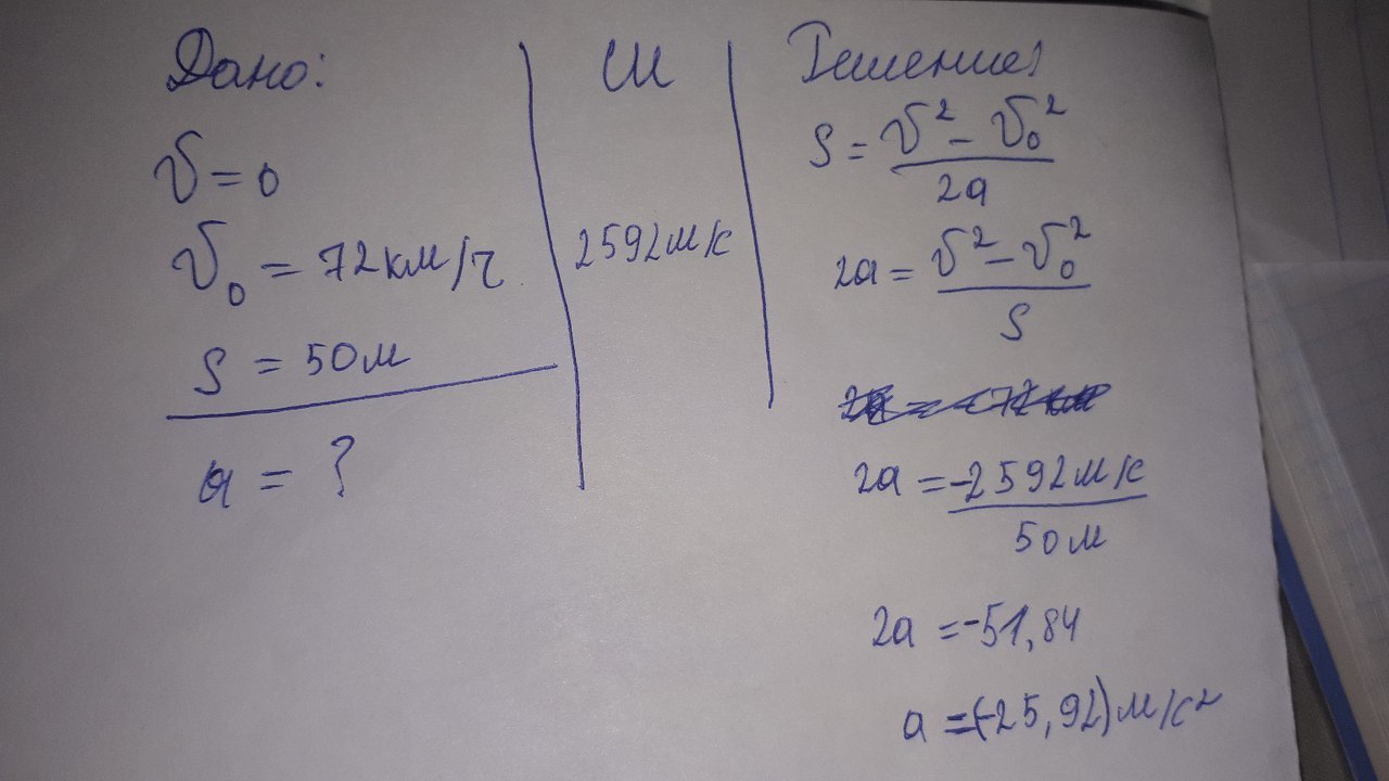 При аварийном торможении автомобиль, движущийся со скоростью 72 км/ч, остановился, пройдя тормозной путь 50 м. Найти ускорение автомобиля при торможении.